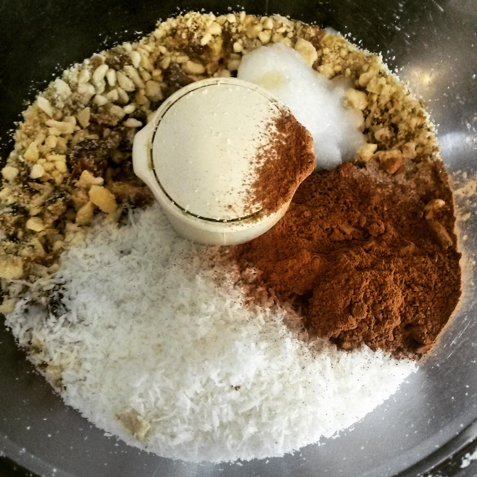 I really got into the basic recipe of dates with nuts and cocoa powder for energy bars/bites, so this is nothing new...just a bit different in taste and shape. Coconut and cocoa is always a good idea, so let's see...